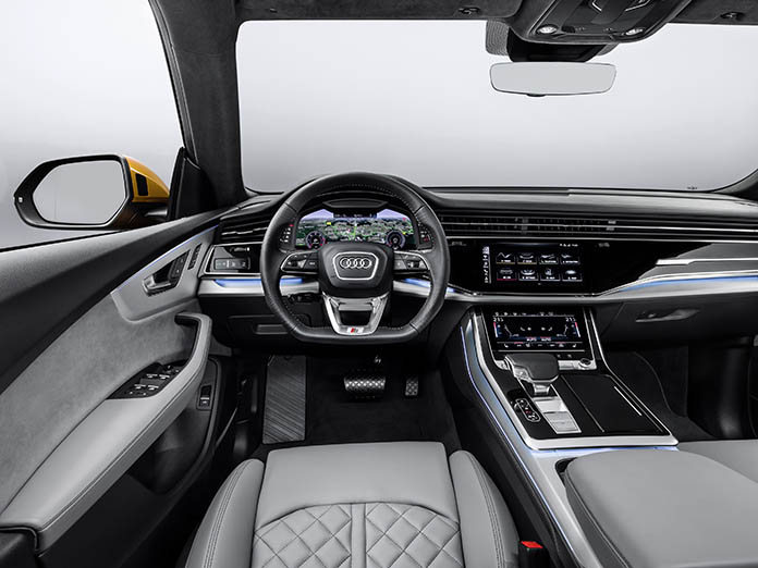 Audi Q8 的車艙設計採取按鈕極簡化直覺設計,並搭載最新一代MMI系統,多項功能皆可透過車內中控台10.1吋與8.6吋雙觸控螢幕控制娛樂系統、導航、溫度空調與細部音量等功能,同時當手指點擊觸控螢幕功能鍵時還能感受如實體般細緻的按鍵回饋感,打造更直覺化、細緻的用車享受給予駕駛及乘車成員。方向盤前方配有12.3吋新一代Audi Virtual Cockpit虛擬數位座艙儀錶,駕駛可於方向盤上切換兩種視覺模式,並於方向盤上快捷鍵執行語音聲控、接聽電話等多項功能,強大功能透過便利設計讓駕駛更容易上手並提高行車安全性。除操作介面走向直覺化之外,Q8 車內更搭載Bang & Olufsen Advanced 3D環繞音響,讓全車成員於每趟旅程中皆能擁有最高級的聽覺饗宴。