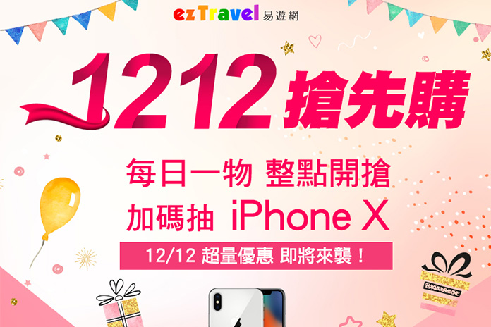 易遊網雙12搶購活動於12月12日中午至15日中午正式開跑,不僅有超誘人的神秘價格外,為刺激買氣,今起不限消費金額,加碼抽iPhone X外,於易遊網APP下訂,天天再送新光三越禮券。此外,購買國外來回機票,還有機會獲得環遊世界雙人機票。史上最狂的雙12旅遊特賣,剁手族千萬別錯過!如欲了解更多資訊,歡迎至易遊網 http://www.eztravel.com.tw/ 查詢。