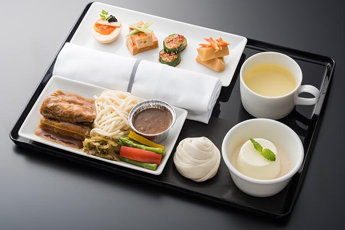 負責此次菜單設計的晶華軒主廚蔡少華表示:「2018年的菜色有兩大主軸,第一部份是要展現台灣人氣美食-牛肉麵的多樣性,第二部分則是要把自己拿手的川粵料理分享給往來台日的旅客們。」一月份推出的是由晶華冠軍牛肉麵為發想的清燉牛肉麵佐奶油野蕈套餐,雖然少了牛肉湯的幫襯、但燉得軟嫩多汁的腱子心肉、滿溢奶油香氣的炒菇蕈以及琥珀糖心蛋、剁椒黃瓜、櫻花嫩筍…等配菜,仍然美味的讓人記憶深刻。七月份請旅客品嘗的是傳承晶華經典美味的紅燒牛肉麵佐香油時蔬,套餐的甜點是可以代表台灣的黑糖愛玉以及香濃順口的芋奶杏仁豆腐,透過兩款甜蜜滑順的台式古早味,溫暖旅客的身心。
