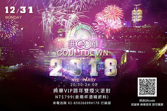 度開放!!!!老闆秘藏景點,大直典華將於2017年12月31日,首次開放頂樓空中花園,舉辦VIP戶外雙煙火跨年派對,現場Live Band熱力開唱,派對不可或缺的調酒、美食,典華這次通通都幫你準備好了!