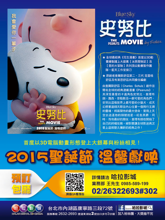 活動資訊電影萬花筒 永遠的好朋友史努比 躍上大螢幕! 由 獨家報導 - 2015 年 10 月 15 日 上午 8:49 FacebookTwitterWhatsAppLINECopy URL 文:哈拉影城 | 圖:福斯影片 提供 漫畫家查爾斯舒茲的作品”史努比”,將首度在大銀幕呈現。包括史努比、查理布朗、露西、奈勒斯、史洛德、佩蒂、糊塗塌客,都將擁有他們銀幕初體驗。最特別的是,這將會以動畫和3D效果呈現。 好朋友預告搶先看 史努比角色製造機 http://www.peanutizeme.com/tw/#40861