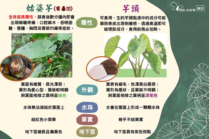 姑婆芋是臺灣常見的低海拔植物,全株的汁液及塊莖皆有毒,在吃下數分鐘後會引起喉嚨疼痛、口腔麻木、燒痛、潰瘍、失聲、吞嚥困難、唇腫、胸悶及胃部灼痛等症狀;他的汁液接觸到皮膚則會引起搔癢及刺激感。