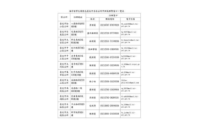 台北市民政局今(11)日表示,為照顧台北市海外留學生,已積極籌備3000份關懷包提供尚未歸國的海外留學生家屬申請。各區公所聯繫窗口一覽表。