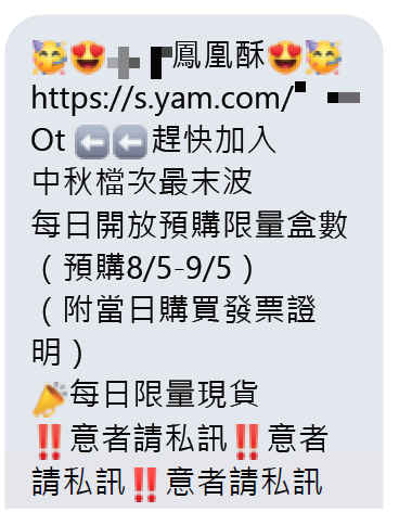 今(2)日刑事警察局偵查第九大隊發現有犯嫌假冒多個知名臉書粉專小編,私訊被害人佯裝欲販售「防疫保單」、「清冠一號」、「肉圓」、「肉粽」、「芒果」、「蛋黃酥」、「鳳凰酥」等商品,並提供假刷卡連結網址予被害人,被害人一時不察,於該釣魚網址輸入信用卡卡號、簡訊驗證碼後,隨即遭犯嫌盜刷。