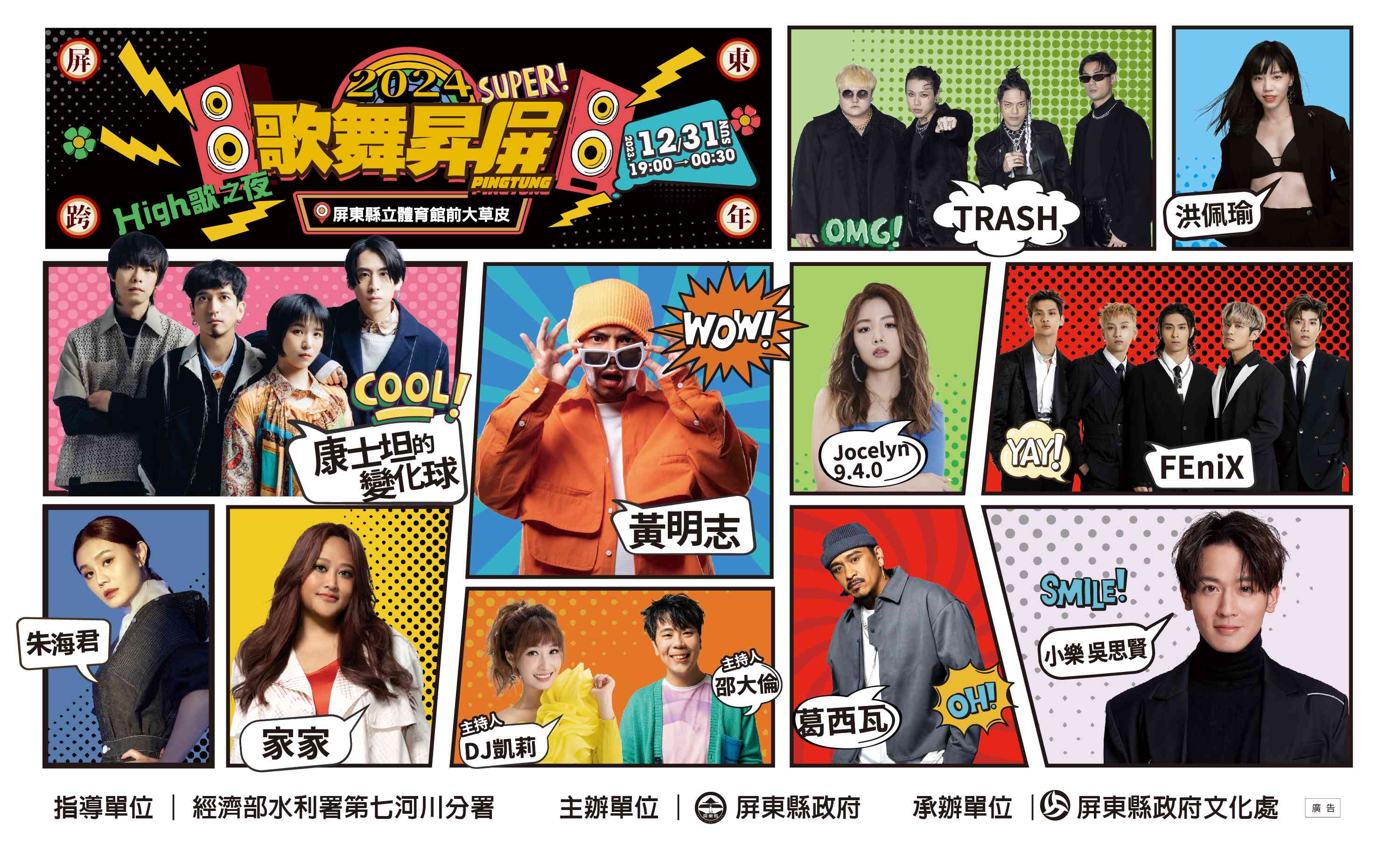 屏東縣政府2024年跨年演唱會「歌舞昇屏 High歌之夜」, 12月31日晚間7時在屏東體育館前草地熱鬧登場,創作鬼才黃明志等10組歌手接力飆唱,陪縣民一同狂歡跨年夜。屏東縣政府22日公佈跨年卡司,包含創作鬼才「黃明志」、人氣樂團「康士坦的變化球」、「TRASH」、實力派歌手「小樂吳思賢」、靈魂歌姬「家家」、人氣男團「FEniX」、金曲新人「洪佩瑜」、原民歌王「葛西瓦」、金曲歌后「朱海君」、R&B小辣椒「Jocelyn 9.4.0」等實力堅強陣容,展開長達5小時不間斷的音樂派對。