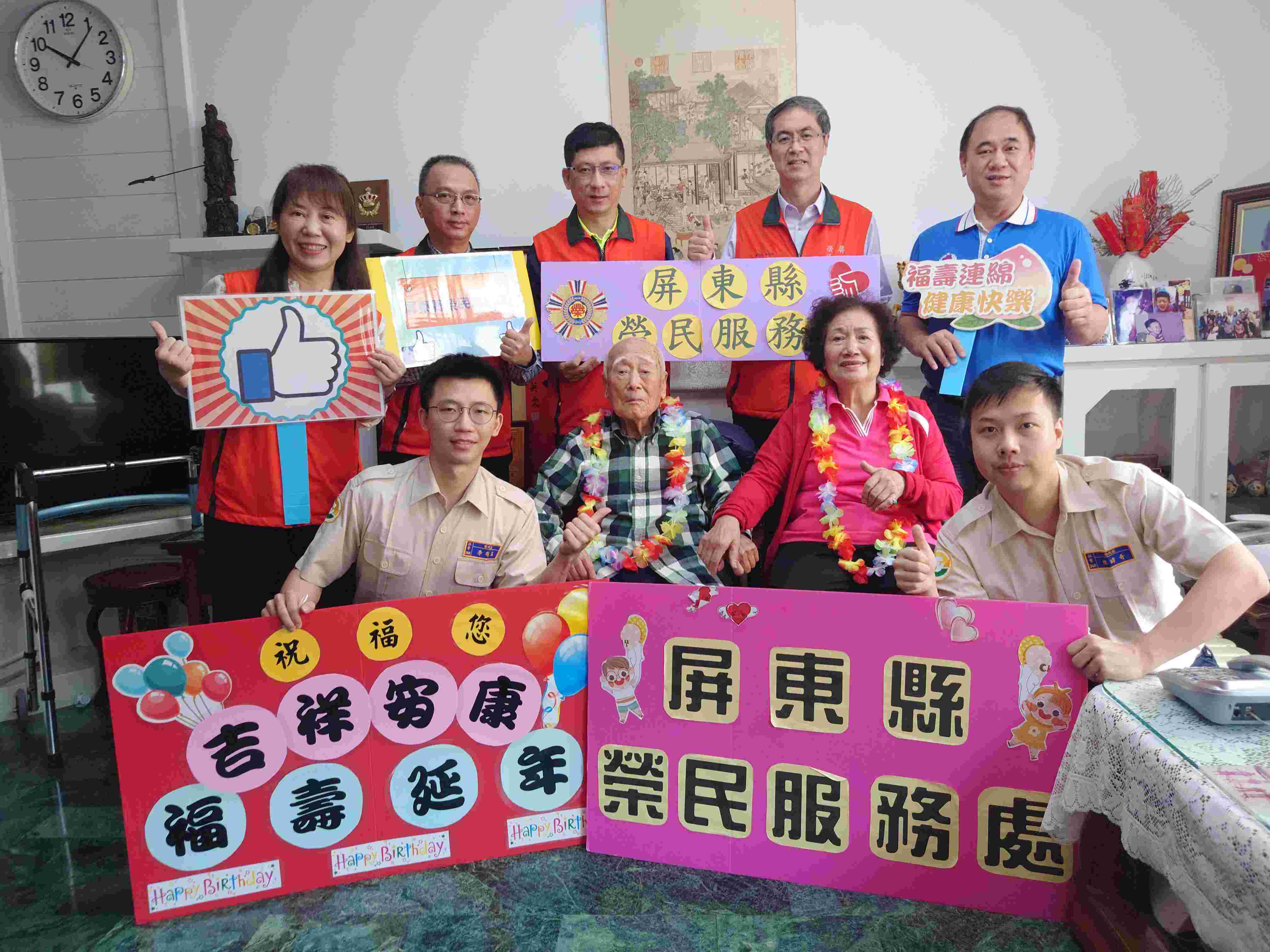 屏東縣榮民服務處處長李秦強偕全體員工,今(18)日前往屏東市慶祝解朗天榮民爺爺101歲生日暨鑽石婚姻,並準備賀卡及禮品一同歡唱生日快樂歌,表達對爺爺的最高敬意與祝福。