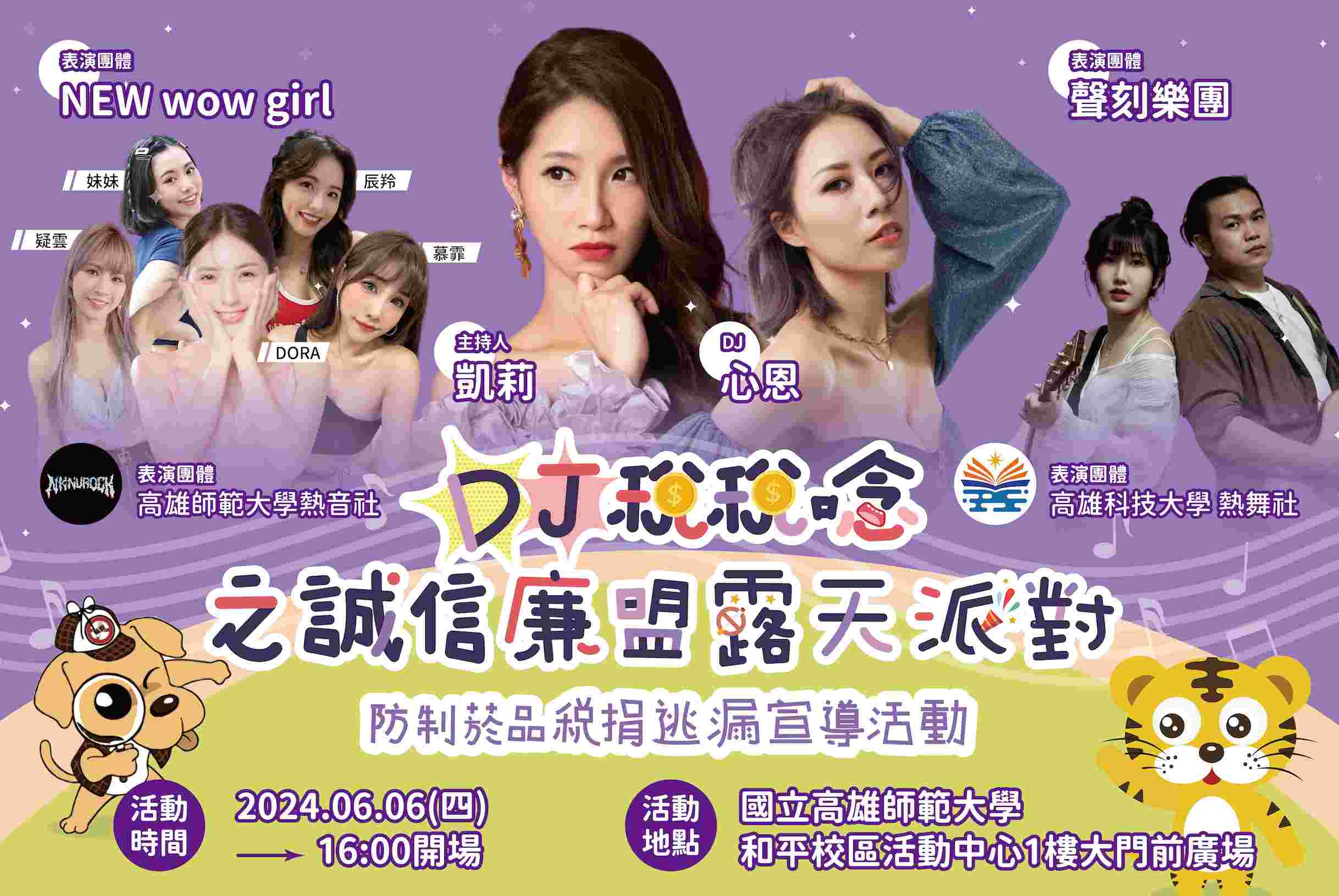 「DJ稅稅唸之誠信廉盟露天派對」將於113年6月6日假國立高雄師範大學和平校區辦理,派對現場將由知名電台主持人帶領大家欣賞精彩表演(人氣啦啦隊表演、雙人彈唱音樂饗宴、熱力四射DJ演出及高師大熱音社、高雄第一科技大學SDC 熱舞社表演)、票選高雄地區校園誠信大使、欣賞露天電影及動動腦有獎徵答活動,周邊更有精采好玩的政令宣導闖關摸好禮及捐發票換美食市集活動,讓青年學生好吃好玩又好看,嗨到最高點!