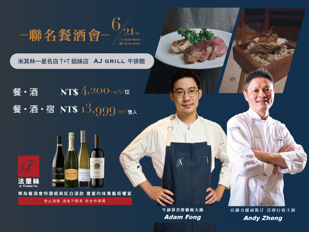宜蘭力麗威斯汀度假酒店即將在2024年6月21日,攜手米其林一星T+T姐妹店,同時為高檔牛排「AJ Grill」主廚Adam馮奕銘,推出「盛夏微醺」餐酒會,結合知名葡萄酒代理商法蘭絲,為賓客帶來一場結合美食與佳釀的夏日味蕾奢華饗宴。