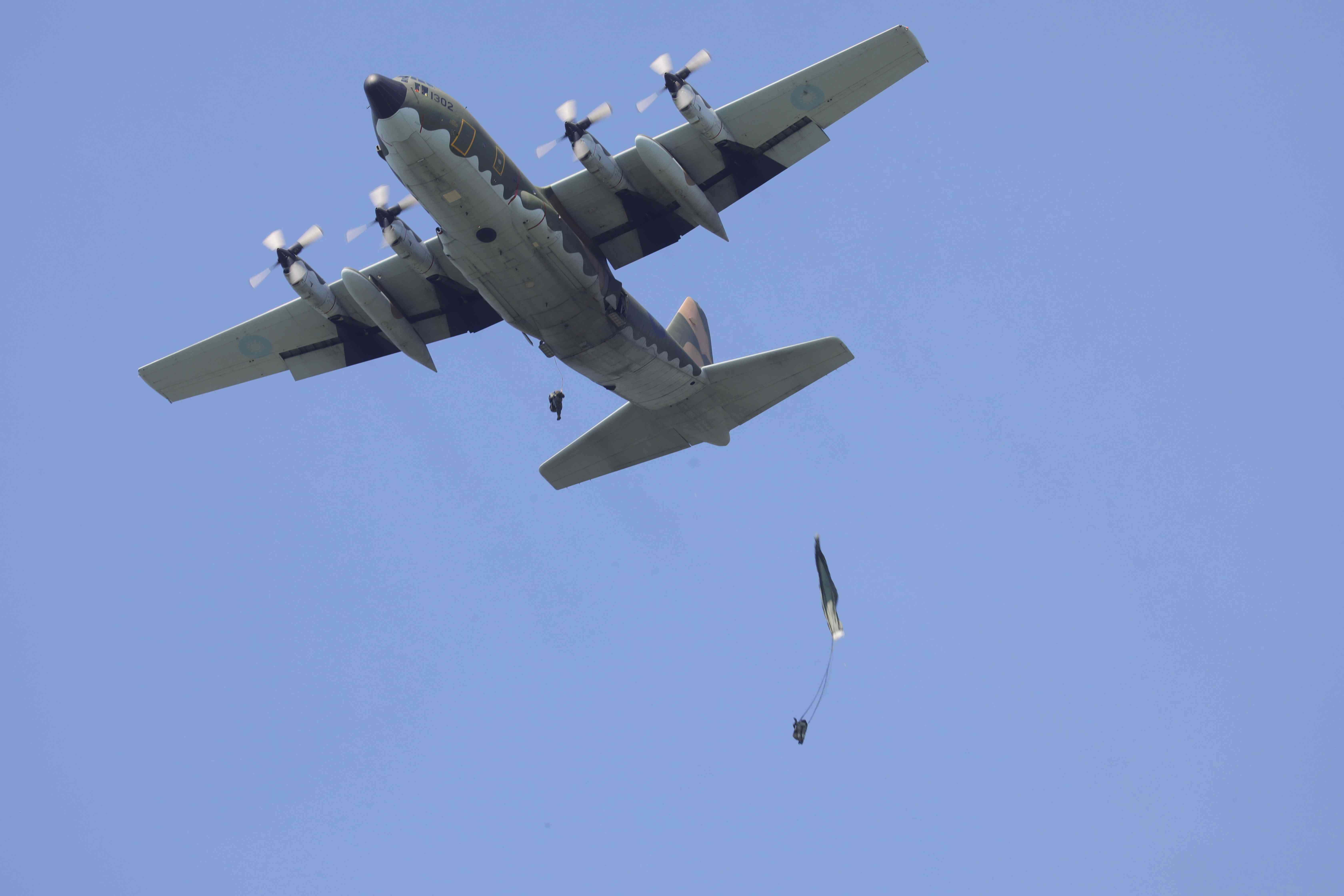 上午實施空降跳傘訓練的陸軍特指部特三營,搭乘C130-H運輸機,共32位區分為4批次,自1250英尺空中跳出,不同於一般基本傘訓學員所使用的T-10B傘,特戰官兵所使用的是MC-1B特種傘,操作性能更好,並能在頂風時操控著陸方向和位置。