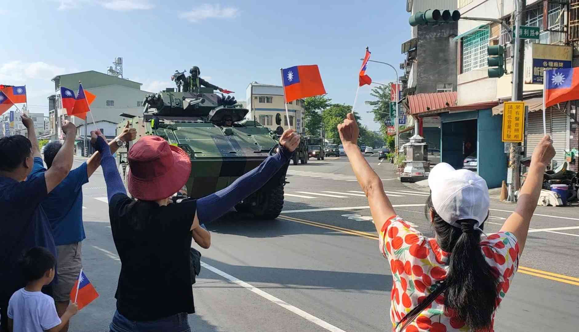 ▲漢光演習前夕,陸軍機步第333旅上午進行戰備偵巡,沿路受到民眾高舉國旗比讚支持。(圖/記者莊全成攝)
