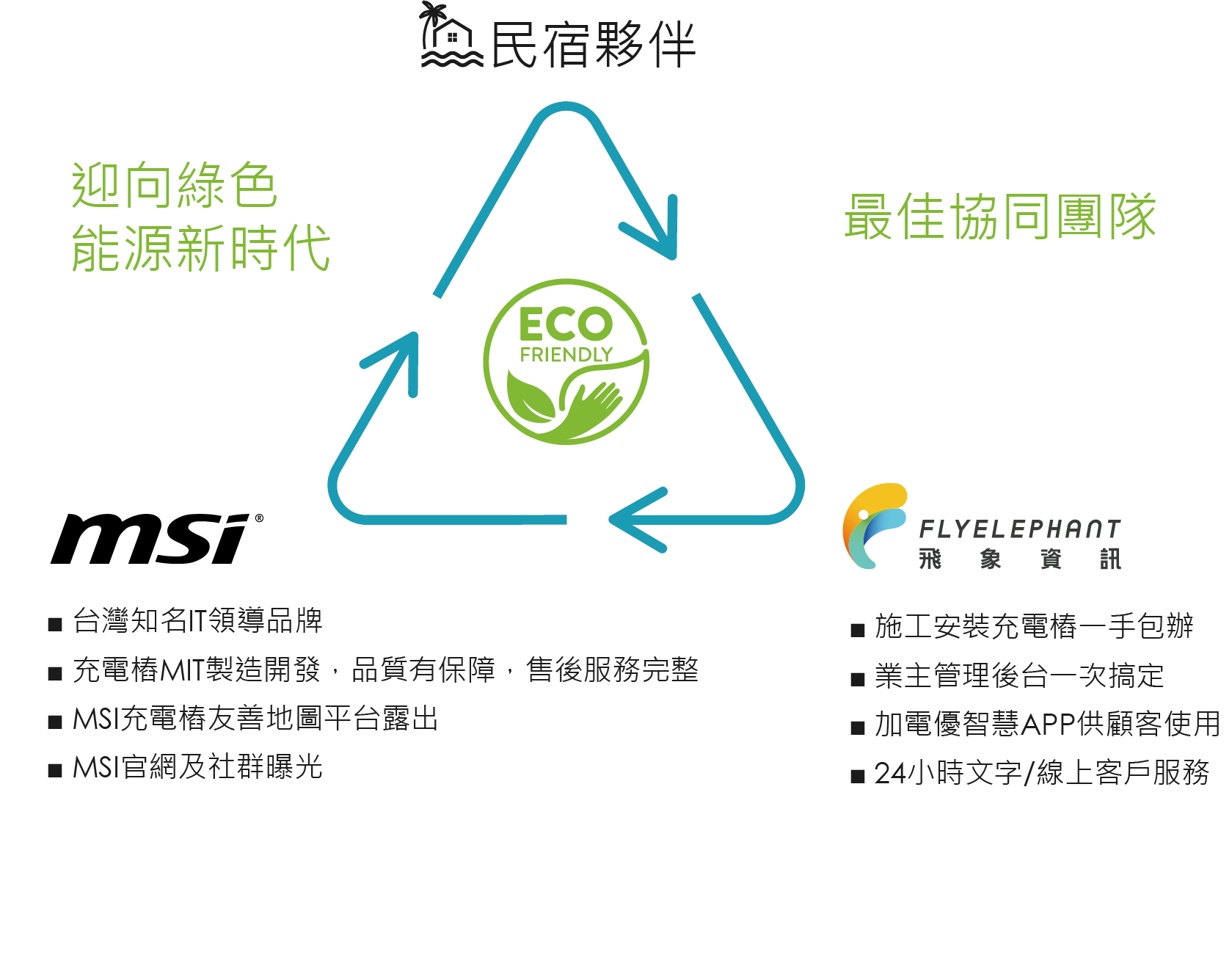 因應新時代的環保趨勢,電動車成為越多年輕購車者的首選,對於民宿業者而言,加裝充電樁能夠有效吸引電車客源,同時也能提升民宿友好感,因此許多民宿業者開始評估建置充電樁的可行性。看準此市場趨勢,由飛象資訊開發的evbar加電優,搭配微星科技的EV系列慢充充電樁,透過軟硬體整合,可望帶給電動車主絕佳的充電體驗。近期,飛象資訊與微星科技合作推出「電動車住宿友善方案」,涵蓋場地諮詢、硬體建置、軟體營運、維護保固等面向,提供全方位充電樁服務規劃,讓民宿業者輕鬆搭上「新能源經濟」的浪潮。
