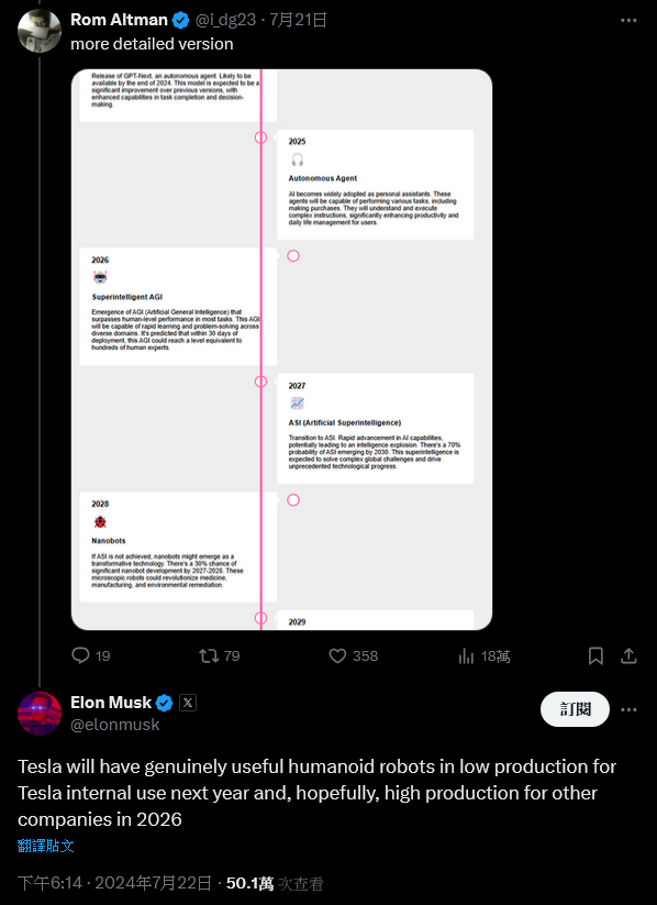 特斯拉執行長馬斯克今年4月曾表示,旗下人形機器人「Optimus」有望在年底前「進駐」工廠執行任務,且預計最快能在2025年底上市。馬斯克22日又透過自家社群平台X推文透露,「明年將少量生產這類機器人供公司內部使用,『期望』能在2026年大量生產這些機器人,供其他公司使用」。特斯拉週一(22日)股價聞訊大漲5.15%、收在251.51美元。