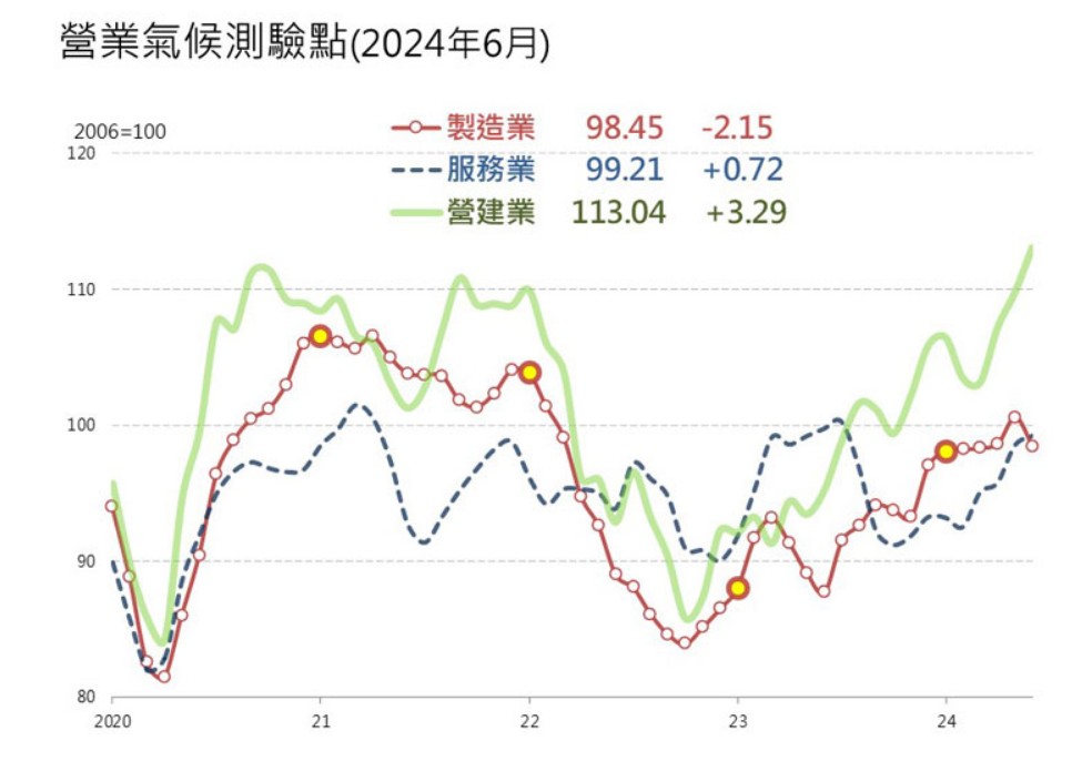 6月製造業營業氣候測驗點為98.45點,月減2.15點,終結連6個月上揚。服務業測驗點為99.21點,月增0.72點,連4升。營建業測驗點為113.04點,月增3.29點,連續3個月上揚。