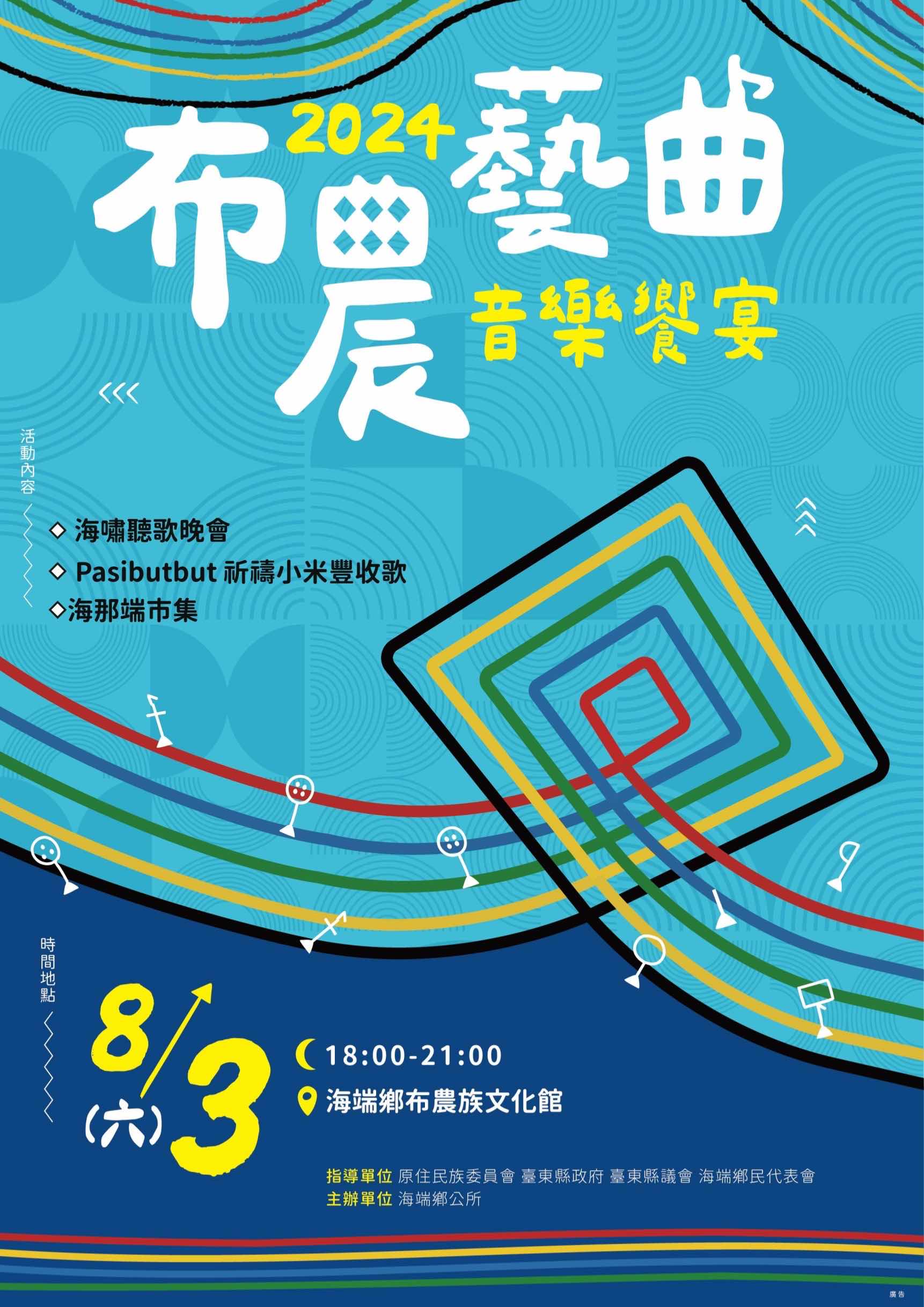 海端鄉公所將於8月3、4日舉行主席盃球類比賽,並於8月3日星期六晚上舉辦113年主席盃特色音樂饗宴活動——布農藝曲。本次活動將邀請知名歌手及表演團體,包括在地崁頂祈禱小米豐收歌團、玩樂音樂、東布青、巴燕庭、發熱帶樂團、PONAY及謝英雄,為大家獻上一場原式音樂搖滾之夜。