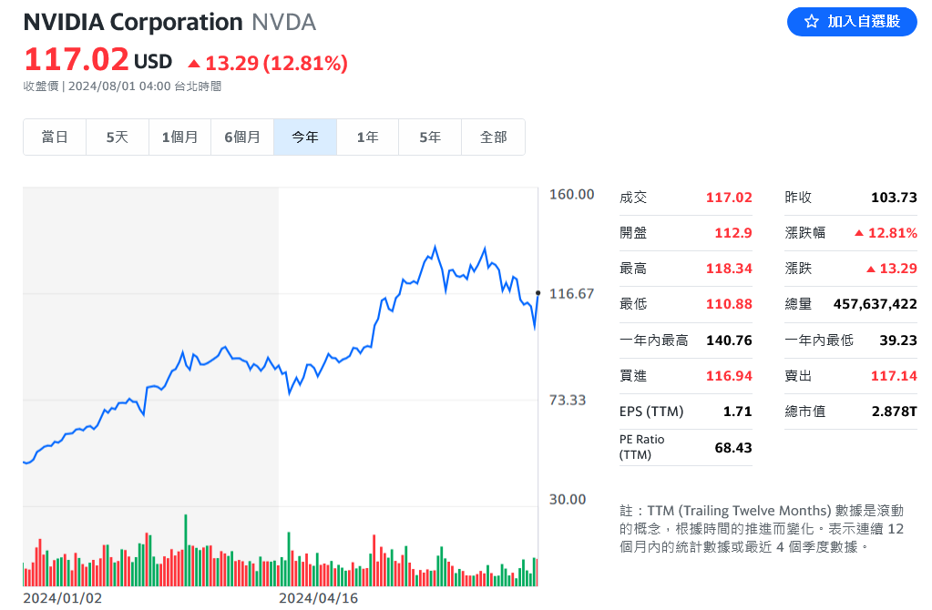 AI天王輝達股價重振雄風,週三(31日)飆漲12.81%、收在117.02美元,漲幅不但躍居費半30支成分股之冠,其市值一夕暴增約3300億美元(約新台幣10.86兆),也刷新華爾街單日市值漲幅紀錄。