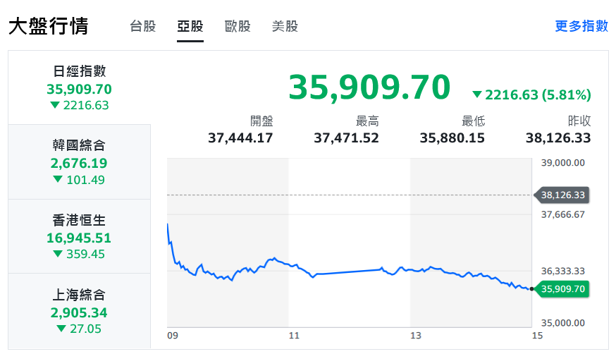 美股重挫引爆殺機,亞股週五(2日)全面大跳水,日股終場下殺2216點、直接摜破36000點大關,跌幅來到5.81%,居亞股跌幅之冠。第二慘跌的是台股,尾盤慘崩逾千點、跌幅4.43%,終場收在21638點,跟日本同寫史上第二大跌點紀錄;韓股今日相對輕傷,終場跌掉101.49點、收在2676點,跌幅約3.65%。