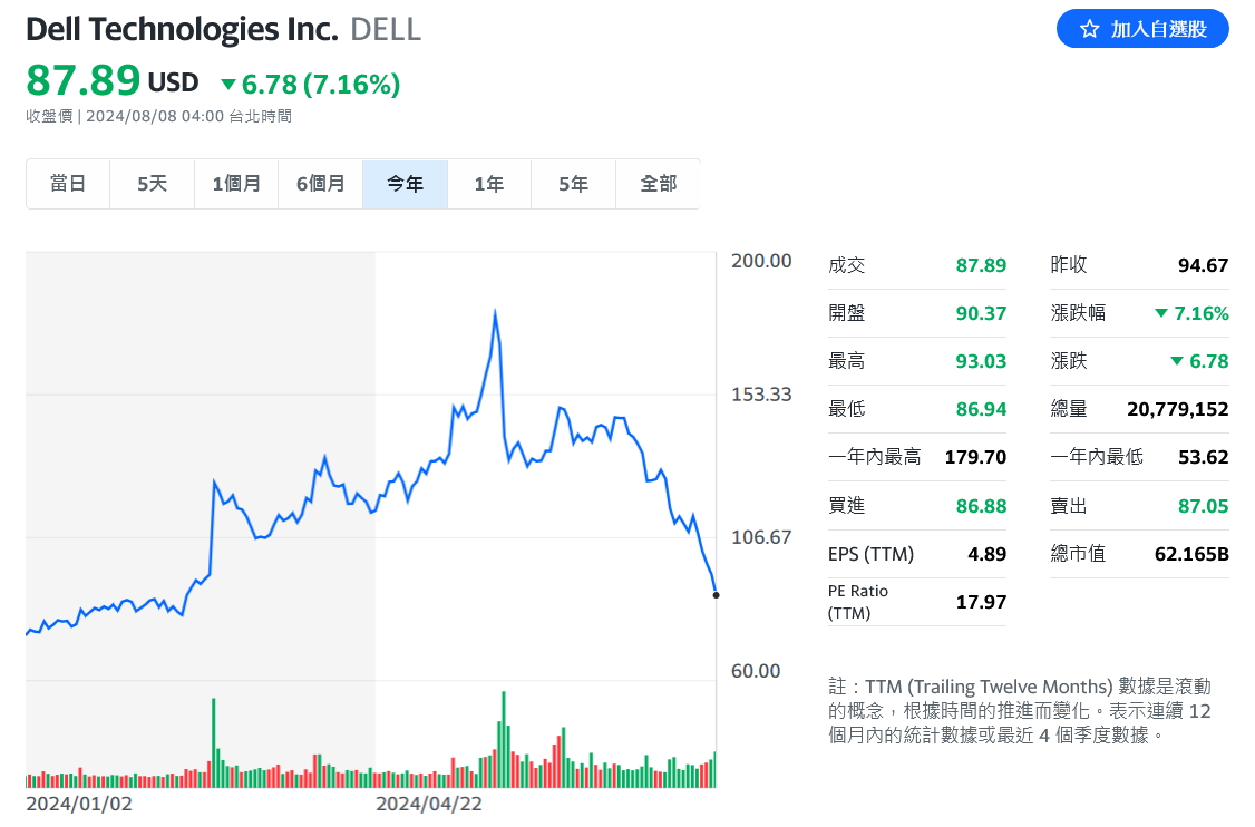 事實上,戴爾早在2023年初,就為了削減成本進行裁員,當時至少在全球裁撤1.3萬名員工,中國產線也因此遭遇嚴重衝擊。隨著AI熱潮席捲股市,戴爾股價在今年以來上漲約34%,但5月29日股價達歷史新高179.70美元後,至今已回吐超過40%。