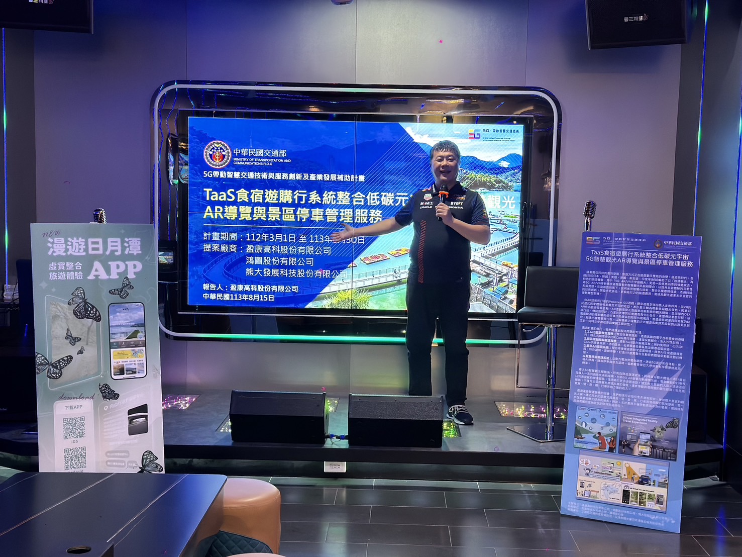 該項「TaaS食宿遊購行系統整合低碳元宇宙5G智慧觀光AR導覽與景區停車管理服務」計畫已於2024年2月底初步建置完成,並將於8月底完成服務驗證,預計在2024年9月正式對外發表。做為我國第一個景區智慧觀光的雛型系統,本計畫以AR/VR虛擬實境及擴增實境導覽服務作為核心平台,在平台上整合了食宿遊購行二維條碼消費核銷的功能,遊客可以輕鬆地透過手機,兌換日月潭景區內的下午茶、晚餐、船票、環湖公車票、民宿旅館、自行車租賃、景區門票、纜車票、台灣好行車票、乃至於魚池鄉農特產紀念品,透過一站式購足的套票組合,讓傳統景區旅遊也能跟上科技進步的速度,邁向智慧觀光的美好願景。