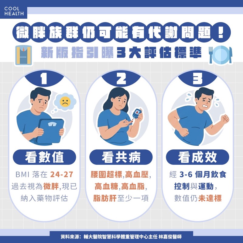台灣肥胖醫學會近期更新《成人肥胖臨床實務指引》,針對 BMI 介於 24 至 27 的成人族群,若合併腰圍超標、高血壓、高血糖或高血脂等肥胖相關共病,且在經過 3 至 6 個月生活型態調整後成效有限,可由醫師進一步進行整體健康與治療方式的評估。此方向亦呼應世界衛生組織將肥胖視為需長期管理之慢性疾病的國際共識。