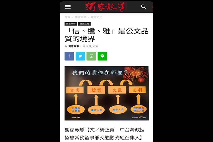 看完了信之後有點遲疑,感覺這不就是一份對我來說,是既新鮮又陌生的不可能任務嗎?因為在臺灣省政府30年公務生涯的磨練下,要我撰寫、核稿或教公務人員「公文寫作」應該還算沒問題;精省後,從臺灣省政府文獻委員會主任委員提早退休,轉換跑道,到靜宜大學觀光事業學系及研究所專任副教授後,因為教學及研究需要,不得不重溫起昔日念研究所研究論文寫作方法,撰寫些半生不熟的「論文寫作」,或許還差強人意。如今要我就某個主題,在2000字左右,起、承、轉、合,四平八穩的去完成完整論述,這對我來說可真的是趕鴨子上架,強我所難啊!
