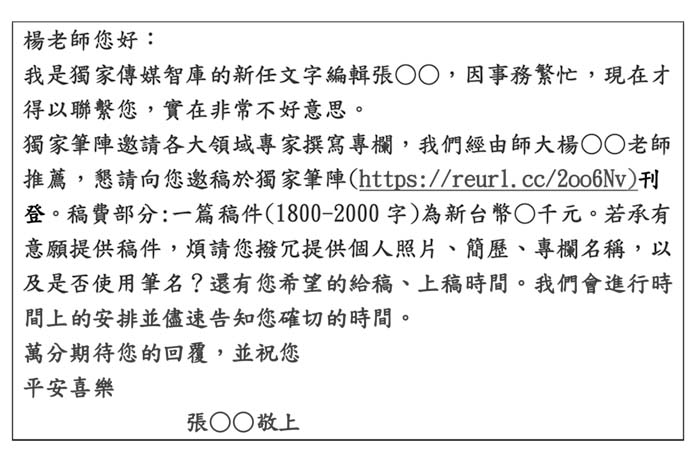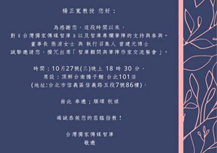 「智庫顧問與筆陣作家交流餐會」邀請函(楊正寬)