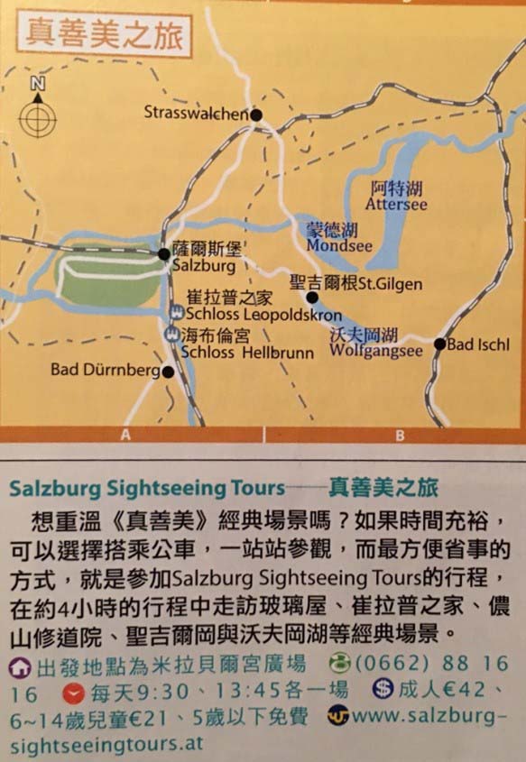 這是一部改編自瑪麗亞馮崔普(Maria von Trapp)的著作《崔普家庭演唱團》(The Story of the Trapp Family Singers)的音樂劇,描述阿爾卑斯山上某處修道院裡一位實習修女到崔普家擔任教職,然後從贏得孩童們的心,到與單身的男主人海軍上校相愛、結婚並組家庭樂團,最後又有驚無險的逃離納粹魔掌的故事。其中,該劇的諸多歌曲,如Do-Re-Mi、孤獨的牧羊人、小白花、My Favorite Things等,至今仍傳唱世界各地,並被翻唱成各國語言版本。故事雖說是發生在阿爾卑斯山,但動人的電影畫面,拍攝的如詩如畫背景風光,卻是在薩爾斯堡(Salzburg)。既然來到奧地利了,就把握回國前的今天(2019/07/31),按照旅遊書規劃好的行程,來一趟薩爾斯堡「真善美之旅」,果然幾十年前看完電影的Feeling,就一幕幕如泉湧般的瀰漫開來。