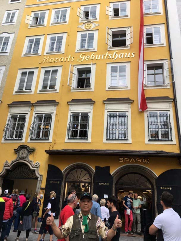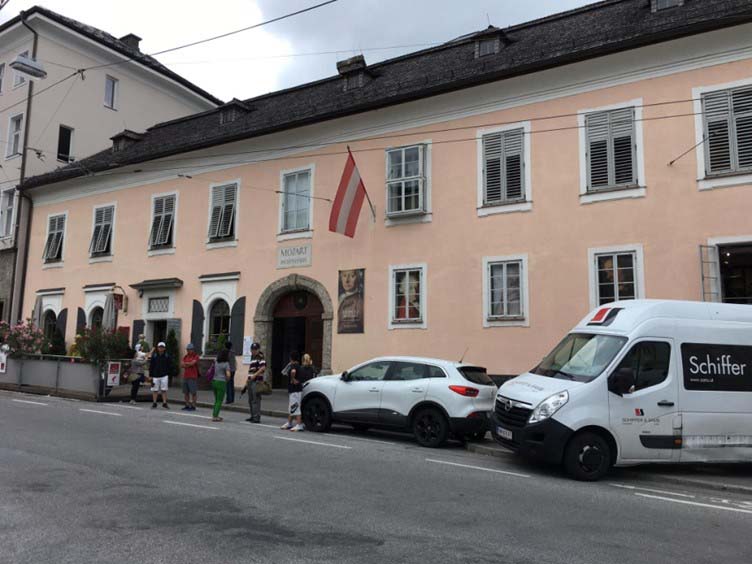 薩爾斯堡也是音樂天才莫札特出生及成長的地方,莫札特(Wolfgang Amadeus Mozart) 1756年1月27日生,是一位音樂的天才,他6歲就開始作曲,在他的人生短短35年中留下《魔笛》、《費加洛婚禮》及《唐喬凡尼》等膾炙人口的作品。此外,莫札特作品非常多元,還遺留有24手輕歌劇、17首彌撒、50首交響曲,以及很多小夜曲、室內樂、教堂樂曲、鋼琴及小提琴協奏曲。從城堡要塞回車站時,我們就順道拜訪了莫札特在舊城區的四層樓住家及故居,他在此居住了17年,他的父母共生了7 個孩子,只有莫札特和他的姊姊安娜存活,這處故居是全世界保留莫札特遺物最完整的地方,可以想像小莫札特在閣樓上努力練琴,或從窗口凝望薩爾河尋找靈感的情景。一、二樓展示莫札特的照片,三樓展示莫札特家族的廚房、家具、信件、樂譜、畫作等,以及珍貴的莫札特幼兒時練習的小提琴和最後一幅肖像。1791年12月5日在維也納去世後,與海頓、貝多芬三人被尊為「維也納古典樂聖」。