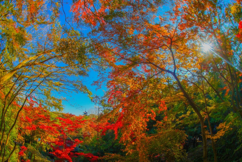 清水寺以其著名的觀景視角,受到遊客喜愛,遊客可以從清水寺俯瞰京都市區,包含秋天的楓紅,遊客能夠看到楓紅和京都的寺廟建築形成古樸又富有詩意的景象。