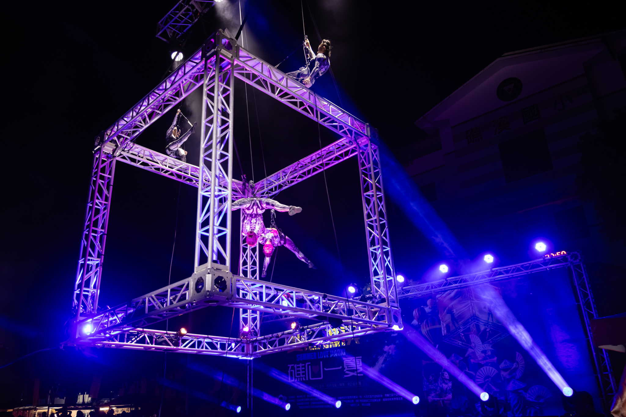 晚會壓軸演出邀請來自義大利,享譽國際「義大利垂直劇院」精采獻藝,該團以高空懸吊表演聞名全球,今晚特地來到礁溪,在夜空中獻上極具詩意與戲劇張力的空中表演。隨著動感燈光與音樂節奏,演員如蝶翼般於空中翱翔,挑戰地心引力的極限,讓現場萬名觀眾驚呼連連,也為「2025夏戀礁溪、礁心一夏」這場國際藝術盛典劃下最華麗的句點。