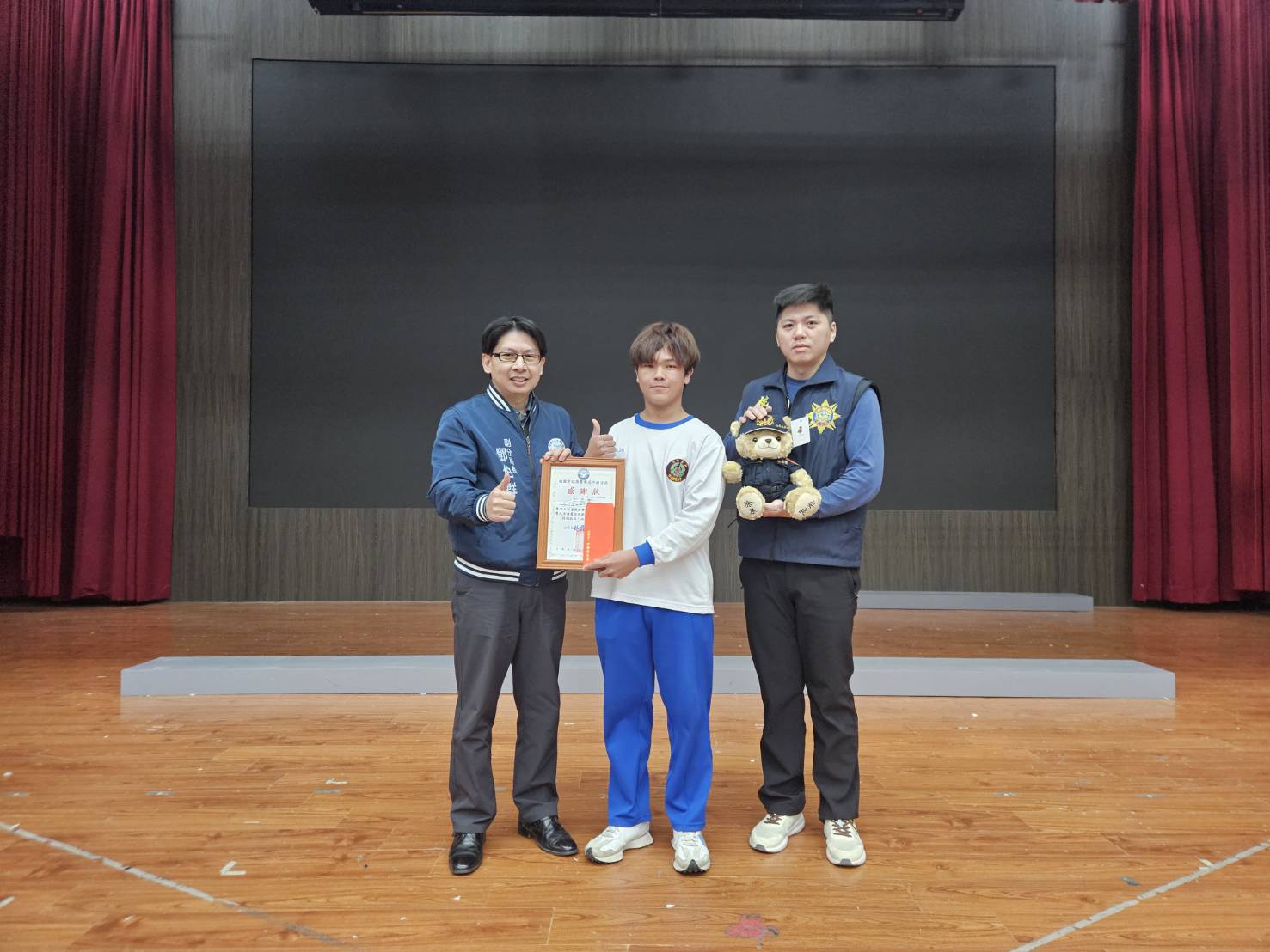 桃園市中壢區日前發生一起銀樓搶奪案件,龍潭高級中學三年級學生張哲瑋正巧行經現場,發現被害人高聲呼救並追逐犯嫌,眼見情況緊急,未選擇旁觀,立即上前協助攔阻並壓制犯嫌,在警方到場前成功阻止其逃逸,中壢警分局獲報後也迅速到場處理,7日也特地到龍潭高中頒發感謝狀、禮券及繡有其姓名的「警察英熊」娃娃表揚張哲瑋的正義之舉。