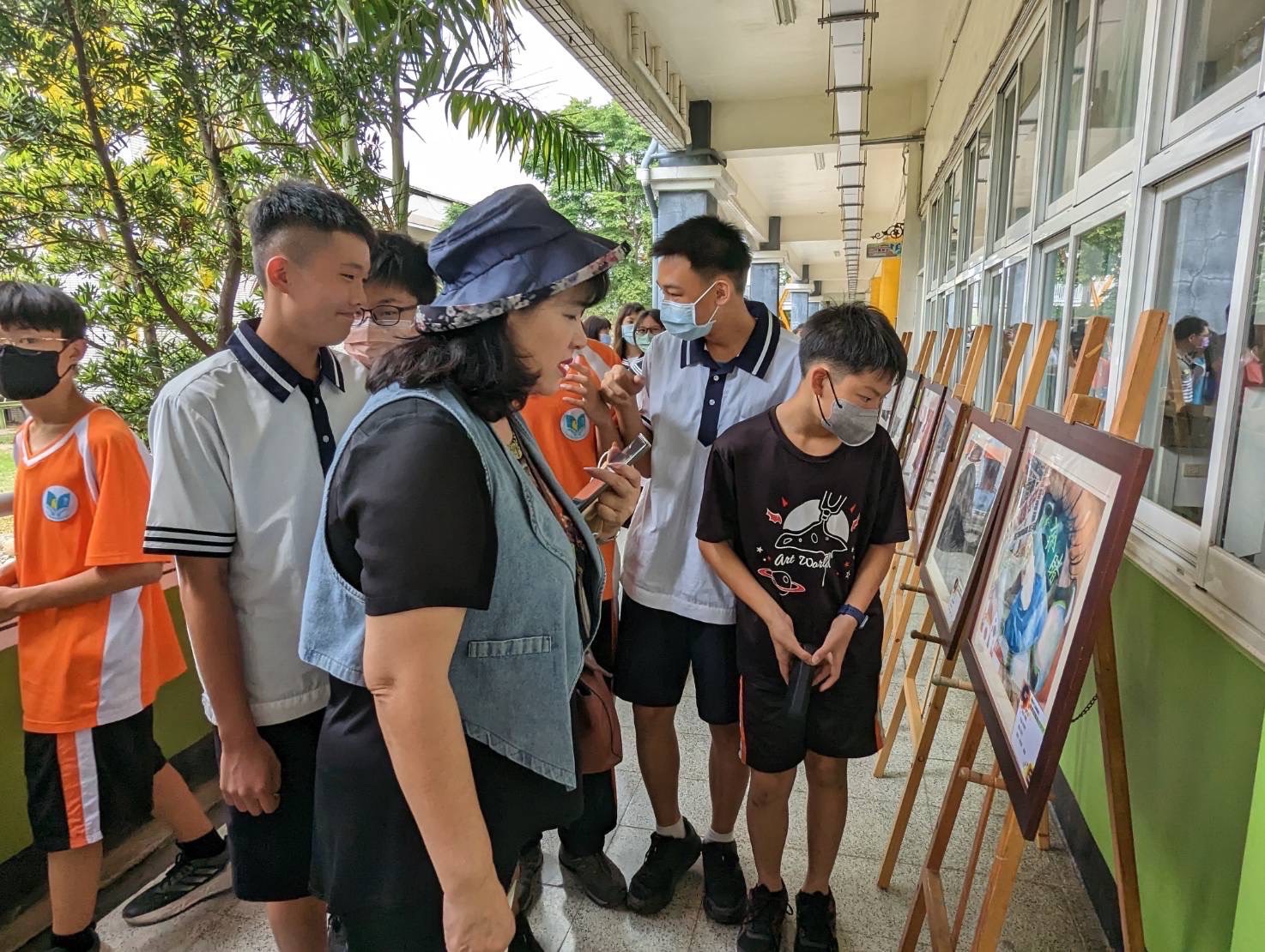 教育局督學沈素甜說,嘉興國中美術班在全國性與全市性的比賽捷報頻傳,今年在高雄市全國美展初賽共計22件作品獲獎,囊括全市前三名共12件,可見美術實力堅強。緊接著分享個人對美的愛好,鼓勵小畫家們把美感與生活互相結合,未來將藝術人生發揚光大。