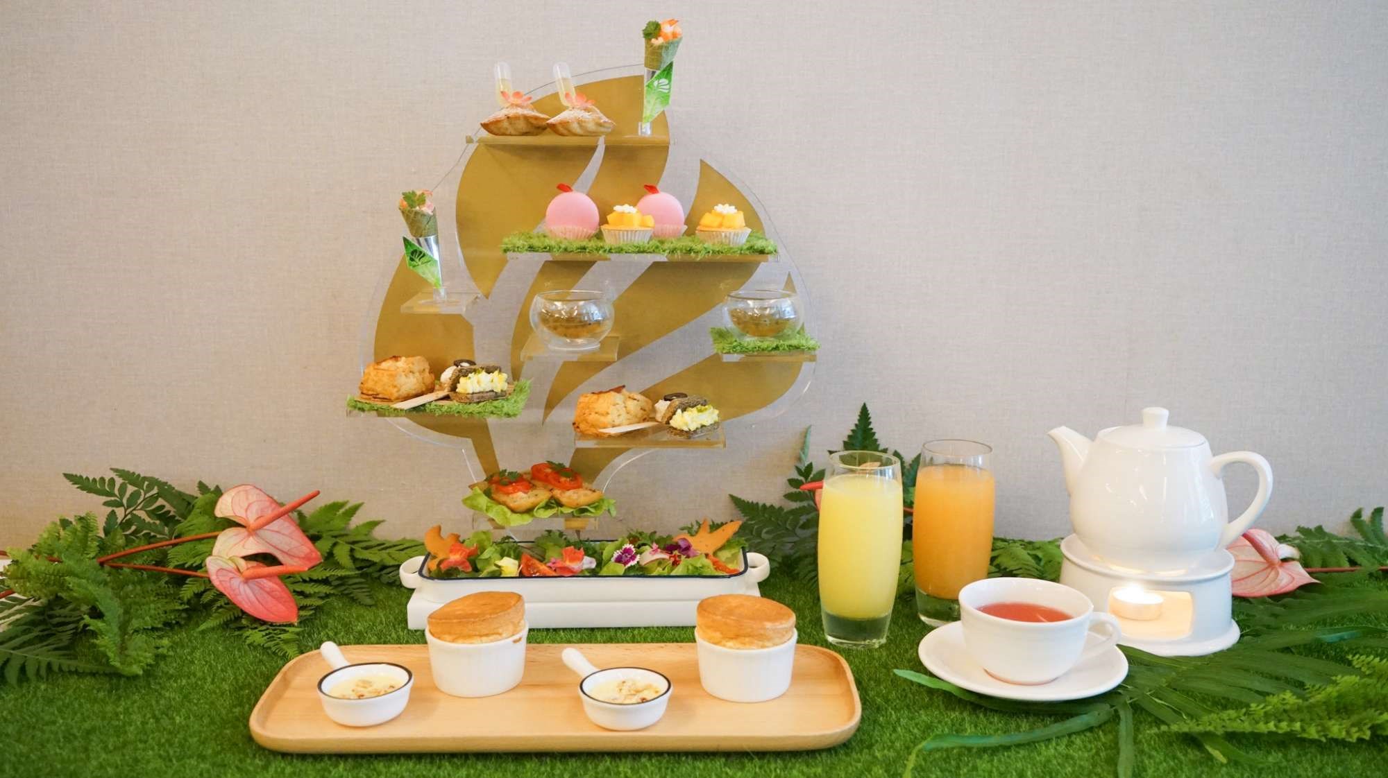 喜歡西餐廳的「花見下午茶」以綠色草地為主視覺,呈現出於彷彿在森林間漫步的悠閒氣息,由 6 款鹹食揭開序幕,「花園沙拉」展現清新優雅之美,搭配手工桂花飛鳥餅乾畫龍點睛;「刺蔥燻雞費南雪」以無麩質米穀粉製成,香氣明顯又健康美味;經典司康則融入楓糖及培根烘焙,佐上橄欖紅洋蔥酸奶醬展現甜鹹交錯的絕妙風味。達克瓦茲嚴選日本進口的QP美乃滋,製成魔鬼蛋餡料;「鮮蝦明太子起士羅勒筒」是迷你甜筒的創意造型,搭配濃郁明太子醬與彈牙鮮蝦絕配組合;微鹹甜風格的「蘆筍舒芙蕾」加上帕瑪森起司松露香醋醬,一掃舒芙蕾只能以甜品呈現的框架,用豐富多層次口感迎來清新夏日的美好時光。而4款甜點則是鹹點後華麗的轉身,以繽紛視覺為主體,「洋甘菊蜂蜜花草茶凍」清爽芳香、「沐夏芒果塔」以當季新鮮芒果搭配優格、「玫瑰桑葚馬卡龍」花香迷人綿密滋潤、「冰心梅瑪德蓮」將台灣特色酸梅乾融入西式點心,再以俏皮滴管注入酸梅湯,為初夏畫上最甜蜜難忘的記憶。