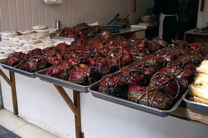 朱家角特色小吃:扎肉、阿婆粽、扎蹄膀、桂花糕、糖藕等,其中又以「札肉」為最具代表的傳統特色小吃,約略3公分大小的五花肉,做法類似於台灣年菜:紅燒滷肉,差異在於每塊五花肉皆用葉子裹札著,店家將製作好的扎肉一塊塊放置於大黑鍋中販售,一塊約略2元人民幣,肥而不膩,肉質鮮美,老街上處處可見遊客們拿在手上大啖這美食;除此之外,還有名氣響亮的─「阿婆粽」,形狀為長方形用水草紮捆著,手工製作,用口味有甜有鹹,任君挑選,一個約略4元人民幣,是當地遊客必嘗美食之一。
