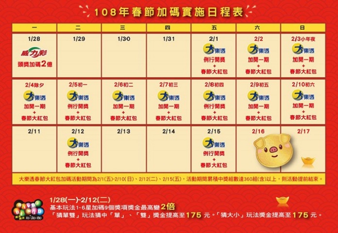 其他文章生活 大樂透加碼春節大紅包 由 獨家報導 - 2019 年 2 月 1 日 下午 6:16 FacebookTwitterWhatsAppLINECopy URL 大樂透春節大紅包加碼時間表 今年台灣彩券春節加碼8億元,其中,大樂透從1日開始連續10天開獎,1日至5日也加開「春節大紅包」,對中9個號碼其中6碼即可得100萬元,加碼期間共提供360組百萬元獎項,若1日至5日春節大紅包360組未開完,活動持續到組數開完或15日為止。