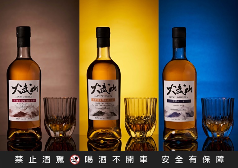 ▲大武山威士忌首戰告捷,國際金獎佳釀齊發——泥煤威士忌(左)、雪莉干邑雙桶(中)、燕麥波本雙桶(右)。