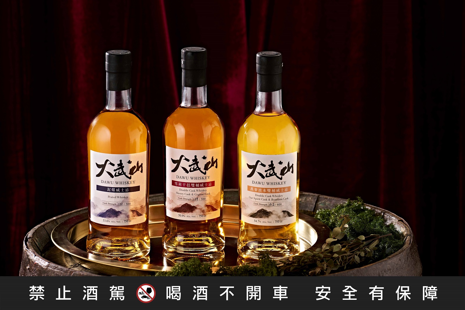 ▲大武山威士忌首戰告捷,國際金獎佳釀齊發——泥煤威士忌(左)、雪莉干邑雙桶(中)、燕麥波本雙桶(右)。