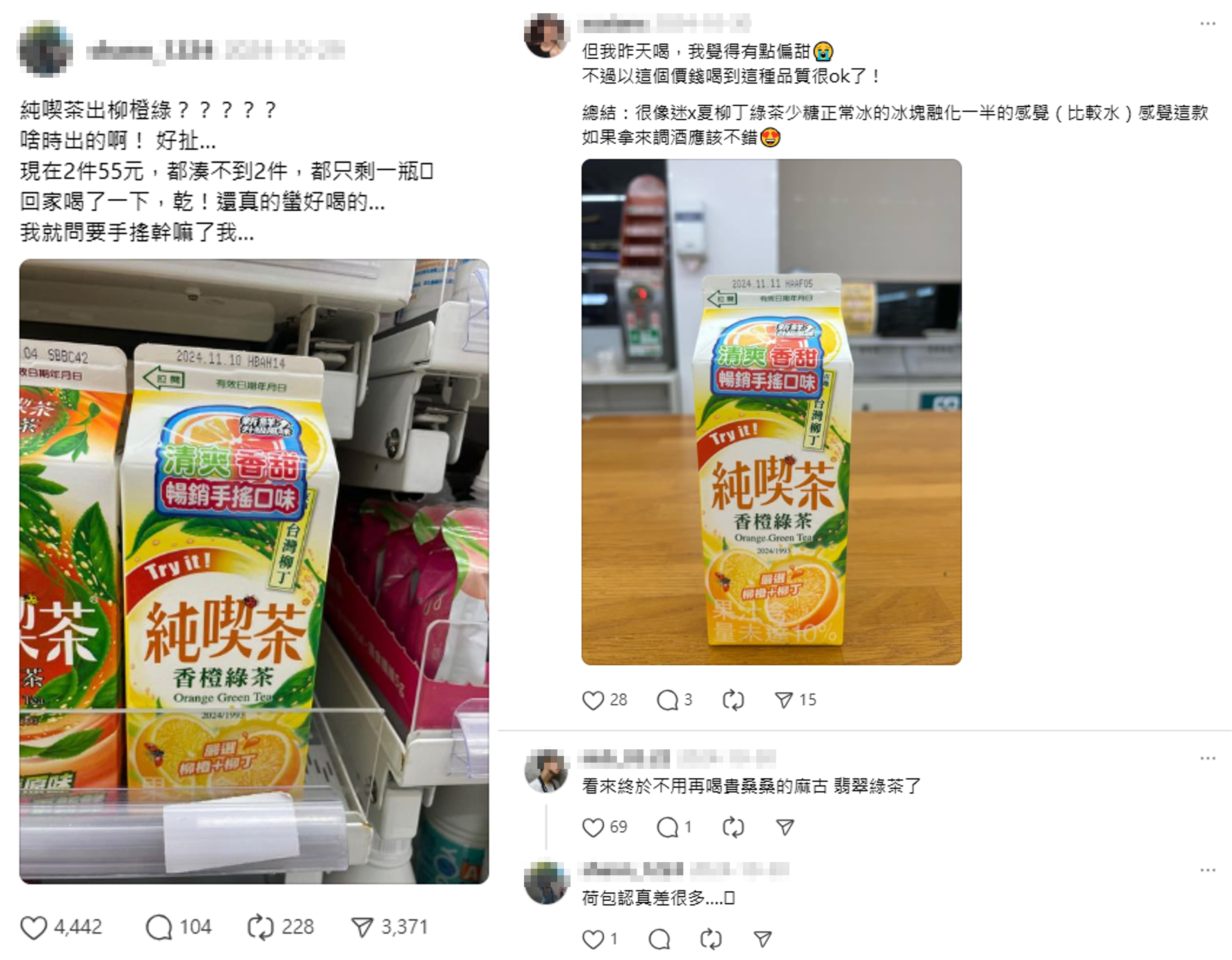網友分享,「這個價錢喝到這樣的品質蠻可以的!」、「這款蠻清爽的,不會死甜,喝起來像手搖的微糖、正常冰」。也有網友打趣說,「我就問,要手搖幹嘛了我」,此外,更有網友專業分析,「很像迷客夏的柳橙綠茶少糖正常冰的冰塊融化一半的感覺,這款如果拿來調酒應該不錯」,甚至有網友直言,「這款完全可以代替手搖飲,手搖的飲料太甜了」。