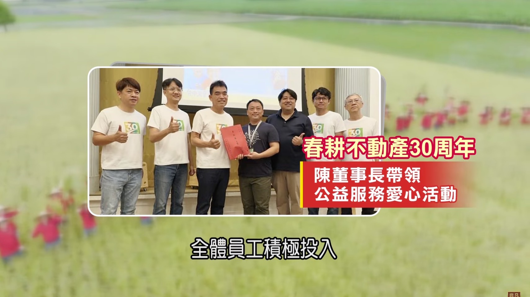除了在不動產市場耕耘,春耕不動產也不忘回饋社會,由陳董事長親自帶領,全體員工積極參與公益活動,希望將知足常樂的正能量植入每位春耕人的心中。陳雅玲表示公司30週年時,有到社福中心進行清掃活動,還有公司自有的福田牧場的每年收成,也都用於回饋社會做公益。