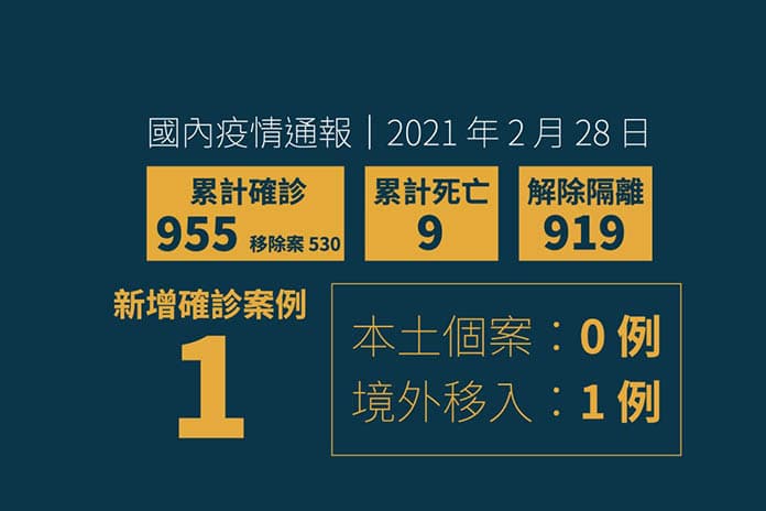 *臺灣中央流行疫情指揮中心2月28日公布新增1例境外移入COVID-19確定病例,為本國籍20多歲男性(案956)。