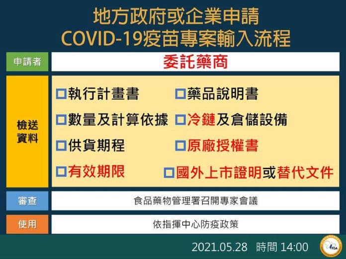企業與地方政府能否自行採購COVID-19(新冠肺炎/武漢肺炎/新型冠狀病毒)疫苗,頻頻引發爭議。指揮中心指揮官陳時中今(28)天公布「地方或企業申請COVID-19疫苗專案輸入流程」,光是檢送資料就有八項條件。強調申請者務必是藥商,並檢送一定資料,送食藥署審查後才能使用。